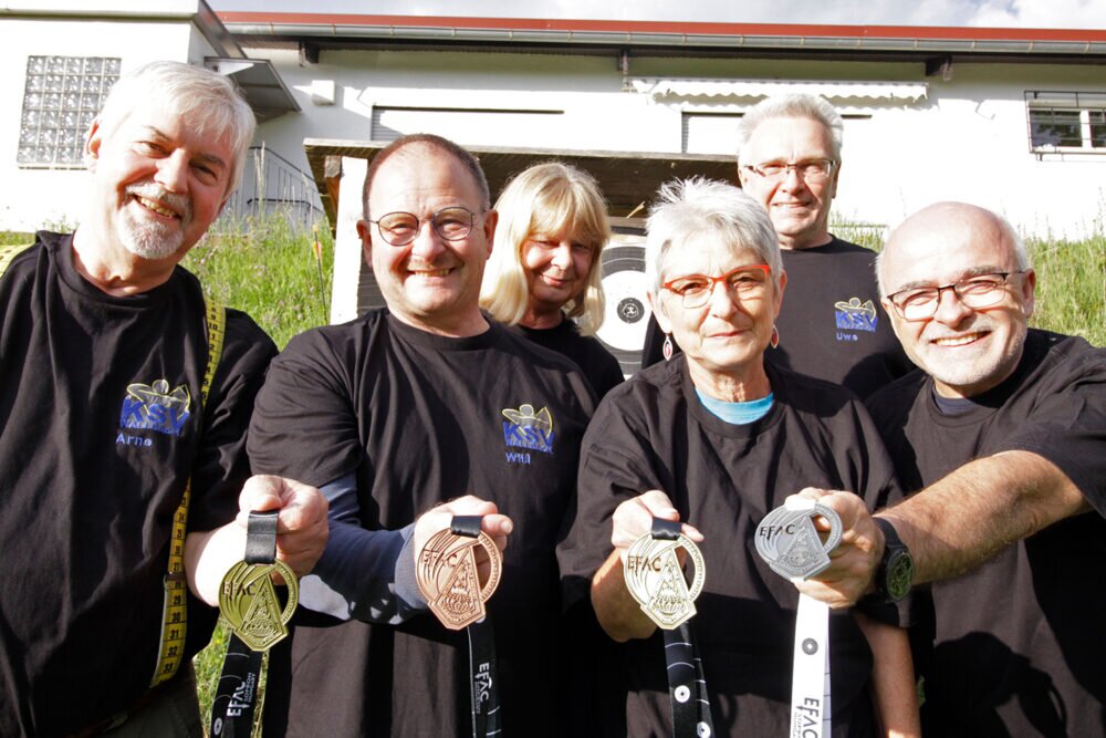 Vier Wallbacher Schützen wurden für ihre Leistungen geehrt. Willi Haßlbauer erhielt in seiner Altersklasse die Bronzemedaille, während Uwe Vogel mit der Stilart-Mannschaft Bearbow Recurve die Silbermedaille gewann. Kornelia Eidenmüller und Arno Kaczmarek erreichten jeweils die Goldmedaille in ihrer Stilart.