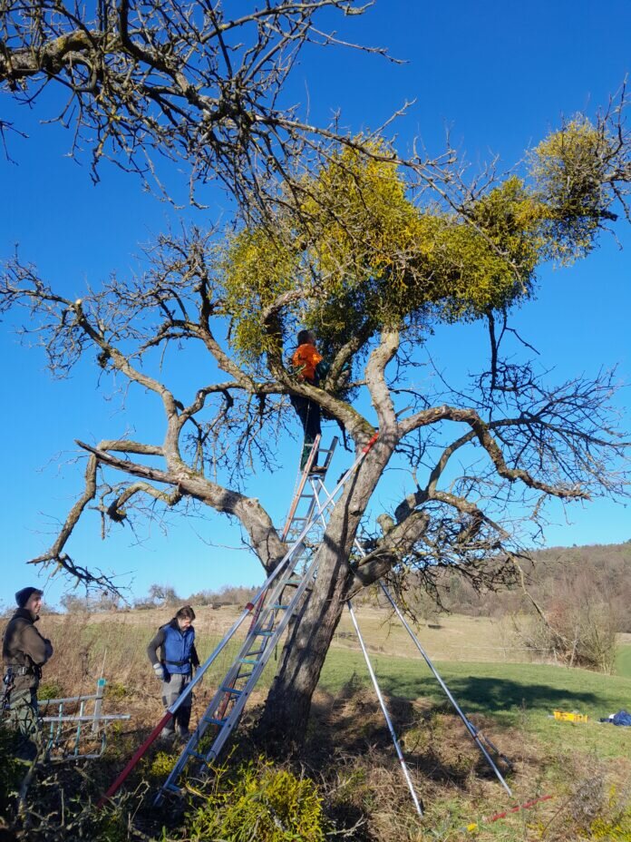 Im Laufe der letzten vier Winterhalbjahre haben die insgesamt 30 Aktiven – 7 von ihnen ständig – die Apfelbäume in Rimhorn von Misteln befreit.