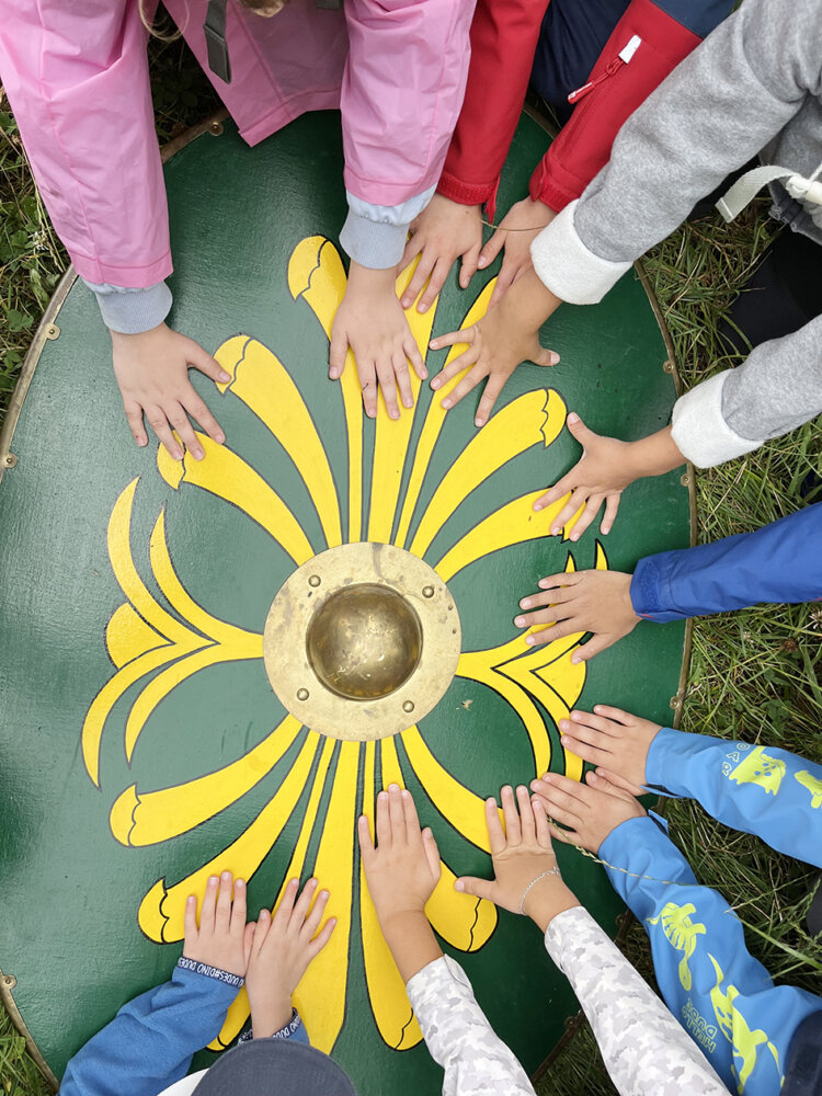 Die Kinder konnten direkt am Lützelbacher Odenwaldlimes und in der Kita den Ausführungen der Kunsthistorikerin folgen. Anschaulich wurde es, als ein Kettenhemd und ein Kurzschwert vorgestellt wurden.