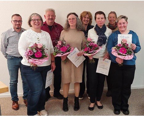 Entsprechend war es dem Vorstand eine besondere Freude, wieder einige der Mitarbeiterinnen für ihre langjährige Tätigkeit bei der Sozialstation zu ehren. Für ihre 10jährige Beschäftigung wurden Yvonne Thierolf, Rebekka Neff, Claudia Roßkopf und Marion Muhn mit einem Blumenpräsent und einer Urkunde ausgezeichnet.