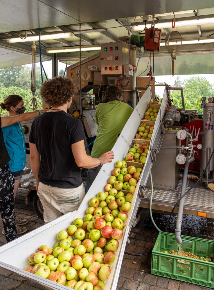 Bei der Kelter handelt es sich um eine moderne und leistungsfähige mobile Obstpresse mit Heizabfüllung zur Pasteurisierung. Das Obst wird gewaschen, zerkleinert und gepresst. Der frische Fruchtsaft wird dann vitaminschonend kurzerhitzt und in Vakuum-Saftboxen abgefüllt. Auch kann der Saft in Behältnisse der Anlieferer zur Weitervergärung zu Apfelwein abgefüllt werden.