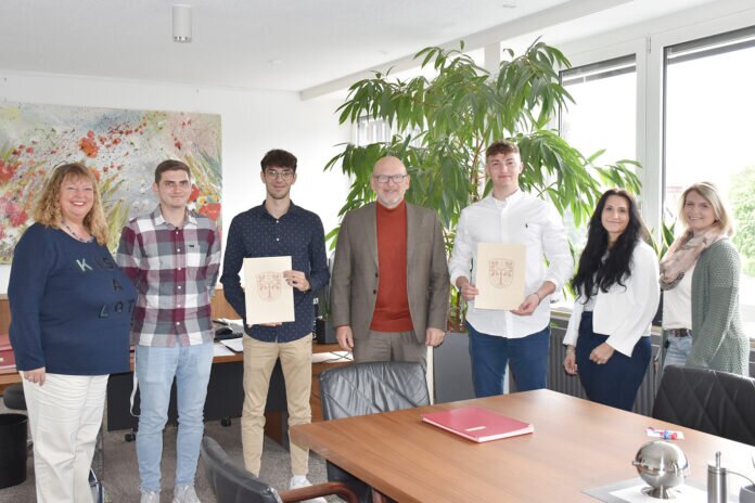 Erbach. Gleich zwei neue akademische Nachwuchskräfte gibt es seit kurzem im Kommunalen Job-Center (KJC). Christopher Scherer und Philipp Koch haben das duale Studium „(B.A.) BASS – Soziale Sicherung und Sozialverwaltungswirtschaft“ beim Odenwaldkreis erfolgreich beendet. Als „B.A. Sozialverwaltungsfachwirte“ werden sie zukünftig in ihren Wunschabteilungen im Job-Center arbeiten. Landrat Frank Matiaske überreichte den beiden Absolventen ihre Ausbildungszeugnisse und gratulierte zu den guten Abschlüssen.