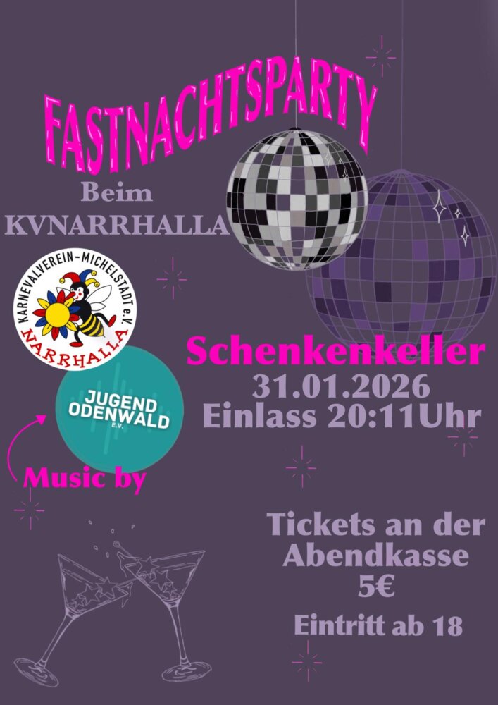 Michelstadt. Der KV Narrhalla Michelstadt ist erfolgreich in die neue Fastnachtskampagne gestartet und lädt nun zu seinen ersten eigenen Veranstaltungen ein. Den Auftakt macht am 31. Januar ab 20.11 Uhr eine Fastnachtsparty im Michelstädter Schenkenkeller. Der Eintritt kostet an der Abendkasse fünf Euro, Einlass ist ab 18 Jahren. Für die Musik sorgen DJs der Jugend Odenwald (@lovekr3w-official und @dentro.music), die ersten 33 Gäste erhalten ein Freigetränk.