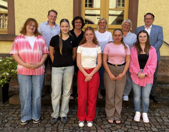 Bürgermeister Dr. Tobias Robischon, Hauptamtsleiter Matthias Nowak, Abteilungsleiterin Stéphanie Lang, Personalratsvertreterin Sandra Reubold und Gleichstellungsbeauftragte Anke Kauer-Lang begrüßten die Auszubildenden bei einer kleinen Feierstunde.