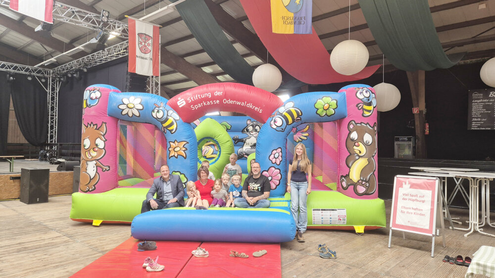 Oberzent. Beim Kinderfest auf dem Beerfelder Pferdemarkt erwartete die Kinder vor Kurzem in der Prof.-Walter-Hofmann-Halle (Reithalle) ein Highlight: Die von 230 Teilnehmern online gewählte Hüpfburg wurde von der Stiftung der Sparkasse Odenwaldkreis an Bürgermeister Christian Kehrer und Jugendpfleger Rene Tunn übergeben.