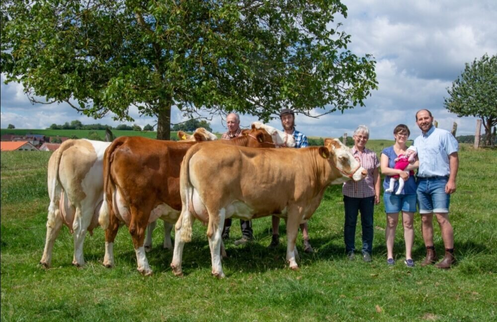 Foto: Mitten im Grünen: Mit einigen ihrer Kühe zu sehen sind (von links) Gerd Zimmermann, Praktikant Leon Baumgartner, Brigitte Zimmermann, Annika Zimmermann mit Valerie und Christian Zimmermann. Foto privat