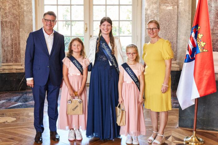 Zusammen mit seiner Frau Tanja Raab-Rhein begrüßte der Regierungschef zahlreiche Repräsentanten aus allen Teilen Hessens, darunter auch die Odenwälder Honigkönigin Lea I. und die Höchster Apfelblütenkönigin Chiara I. mit ihren Apfelblütenprinzessinnen Emmi Göttmann und Nora Schäfer.