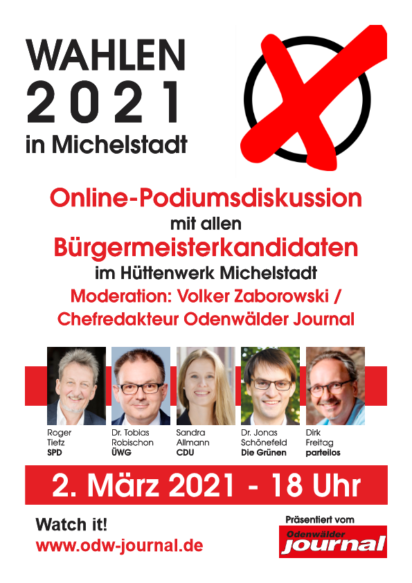 …am 2. März, 18 Uhr, gibt es eine Podiumsdiskussion mit allen Bürgermeisterkandidaten, die sich um den Rathaussessel in Michelstadt bemühen.