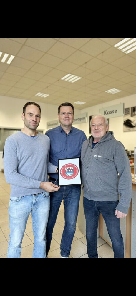 Die offizielle Sponsoringurkunde wurde vor kurzem vom 2. Vorsitzenden Tim Mathes an die Vertreter des Treffpunkt Thierolfs Holger Heim und Jens Fröhlich überreicht.