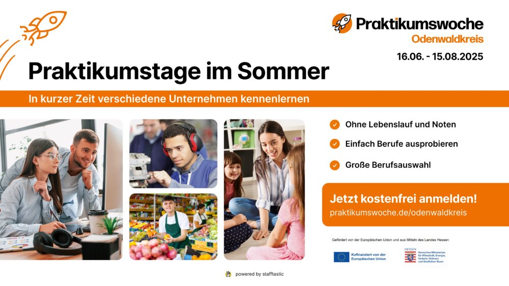 Odenwaldkreis. Die hessischen Praktikumstage finden von Montag, 16. Juni, bis zum 15. August statt. Anmeldungen für Unternehmen sind bis zum 4. Juli möglich für Schüler bis zum 18. Juli. Infos und Erklärvideos gibt es unter: www.praktikumswoche.de/odenwaldkreis.