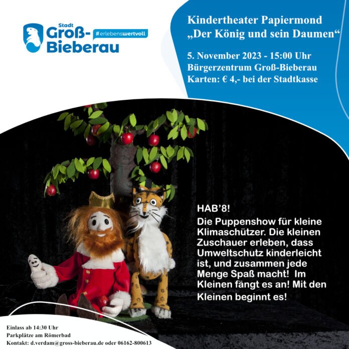 Groß-Bieberau. Am Sonntag, 5. November, kommt die Puppenshow “Der König und sein Daumen” des Kindertheaters Papiermond in den Großen Saal im Bürgerzentrum.