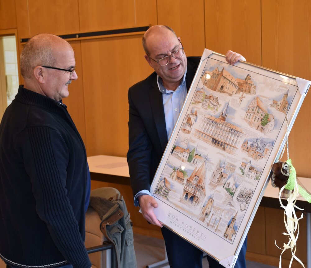 Reichelsheim. Nach über 33 Jahren als Hausmeister an der Georg-August-Zinn Schule geht Herbert Arras zum 31. Dezember in den Ruhestand. Bei einer kleinen Feierstunde im Landratsamt überreichte Erster Kreisbeigeordneter und Schuldezernent Oliver Grobeis ihm die offizielle Urkunde und als Erinnerung an die Dienstzeit ein Bild des Odenwälder Künstlers Rob Roberts.