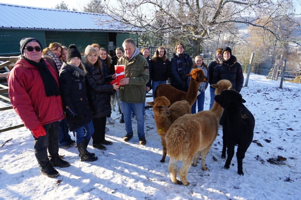 Im Rahmen der Aktion „Schuhe putzen für Peru“ der Goetheschule in Dieburg für die Partnerschule dem „Colegio Valle Sagrado“ in Urubamba (Peru) besuchten Schüler aus Dieburg die Alpakafarm von Willi und Ilse Keil in Reichelsheim. Dort überreichte Keil den Schülern 750 Euro als Spende, zudem sollen wieder 50 Prozent der Patenschaftsbeiträge für die Alpakatiere an die Partnerschule in Urubamba überwiesen werden. Dazu kommen noch 800 Euro aus dem Verkauf von Lamaschlüsselanhängern.