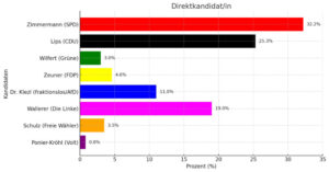 Das Direktmandat wäre nach Schülerwillen an Dr. Jens Zimmermann (SPD) mit 32,2 Prozent gegangen. Ihm folgten Patricia Lips mit 25,3, Christian Wallerer (die Linke) mit 19, Dr. Helmut Klezl (fraktionslos / AfD) mit 11, Mathias Zeuner (FDP) mit 4,6, Laura Schulz (freie Wähler) mit 3,5, Boris Wilfert (Bündnis 90 / Die Grünen) mit 3 und Thomas Ponier-Kröhl (Volt) mit 0,8 Prozent der abgegebenen Stimmen.