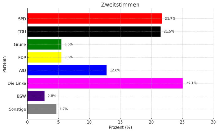 Als stärkste Kraft bei den Schülern der Klassen 9 bis 13 und die FÖL2 schnitt dabei die Partei die Linke ab, die 25,1 Prozent der Zweitstimmen erreichte. Den zweiten Platz belegte die SPD mit 21,7 Prozent, dicht gefolgt von der CDU, die 21,5 Prozent der abgegebenen Stimmen auf sich vereinen konnte. Es folgen die AfD mit 12,8, Bündnis 90 / Die Grünen und FDP mit jeweils 5,5 und das BSW mit 2,8 Prozent.