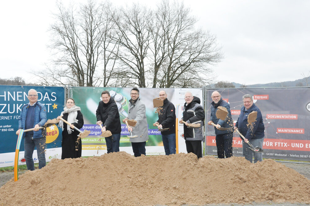 Zum Spatenstich nach Fränkisch-Crumbach kamen neben Bürgermeister Horlacher der Geschäftsführer der OGIG, Marius Schwabe, Detlef Kuhn, Prokurist der OGIG, Christoph Busch, Vorsitzender der Geschäftsführung bei ENTEGA Medianet sowie Paul Quiskamp, Geschäftsführer Klenk & Sohn GmbH, Rainer Müller, Bürgermeister von Brensbach, Jürgen Walther von der Klenk & Sohn GmbH und Bettina Schuller von der ENTEGA Medianet GmbH.