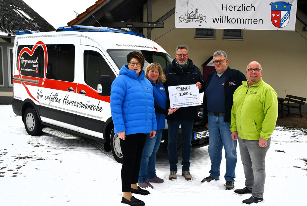Michelstadt. Der Heimat-und Kulturverein aus Würzberg für das DRK-Herzenswunschmobil hat kürzlich einen Scheck über 2.000 Euro für das DRK-Herzenswunschmobil gespendet. Dieser Betrag der 2003 gegründeten Theatergruppe „Iwwerzwäisch“ setzt sich aus den addierten zwei Euro zusammen, die die Darsteller mit ihrem aktuellen Stück „Aasgeier über Würzberg“ von den Eintrittsgeldern abgezweigt haben.
