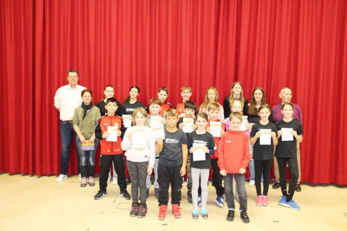 Im Rahmen der Sportlerehrung wurde auch die Sportabzeichenverleihung vorgenommen. Sportabzeichenstützpunktleiter Adam Schleucher zeichnete 24 Kinder und Jugendliche aus. red