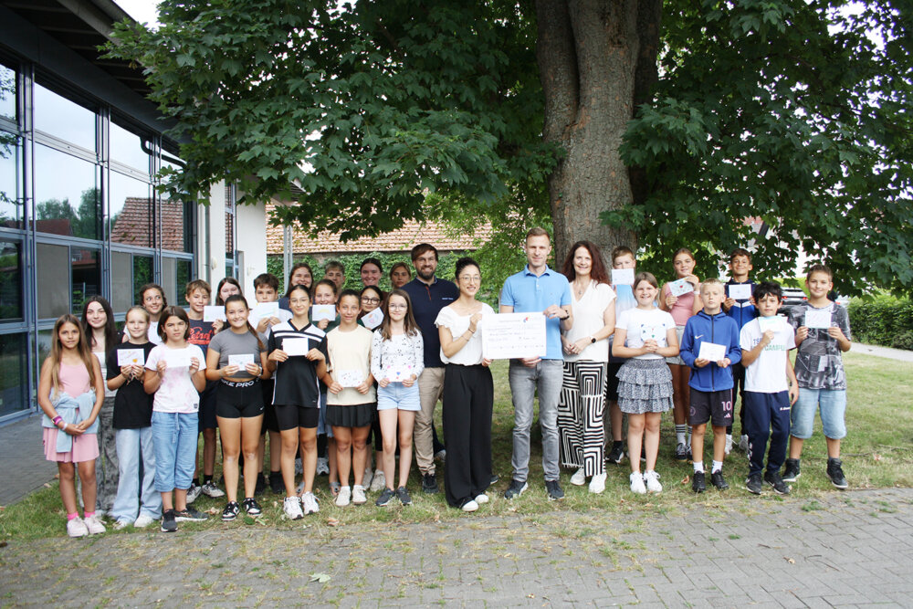 Die Idee kam von Schüler Kinan Hofmann (E11d), die Umsetzung erfolgte mit seiner Klasse und Lehrerin Aydan Özkan. Jüngst überreichten sie gemeinsam mit der Klasse 5Ga und dem stellvertretenden Schulleiter Tobias Benz den erlaufenen Spendenscheck von über 20.320 Euro an Johannes Ochs vom Verein.