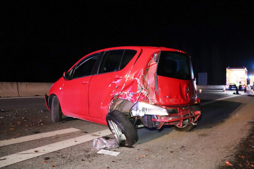 Durch den Auffahrunfall wurde der Opel nach rechts geschleudert, prallte gegen die Leitplanke und blieb auf der rechten Spur liegen. Der VW landete auf dem Dach.