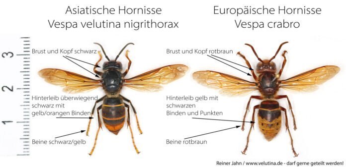 Die Invasive, nicht heimische Asiatische Hornisse unterscheidet sich optisch von ihrer deutschen Verwandten. Um die Verbreitung der nicht heimischen Art im Blick zu behalten, bittet die Untere Naturschutzbehörde die Bevölkerung, Hornissennester zu melden, am besten mit Foto eines Tieres. Foto: Reiner Jahn / www.velutina.de