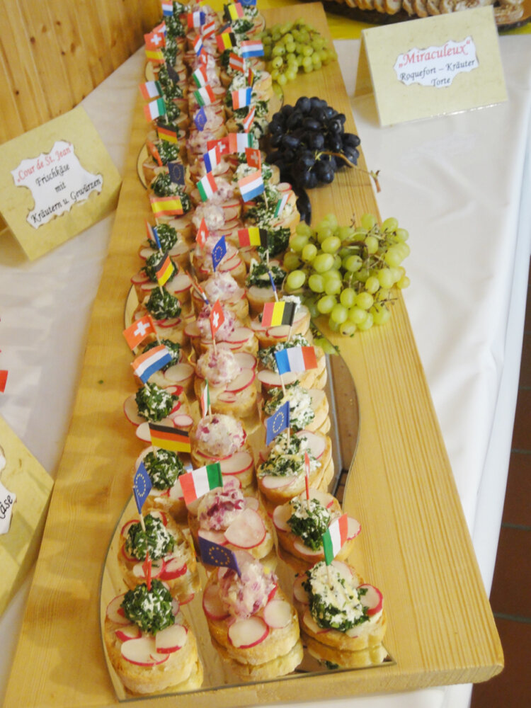 Neben Köstlichkeiten aus großer Pfanne gibt es Käsespezialitäten wie Cour de Saint Jean, Rodensteiner Zwiebelkäse, die Milde Roquefort Käsekräutertorte und gefüllte Datteln oder Erdbeeren mit einer Cognac-Käsecreme.