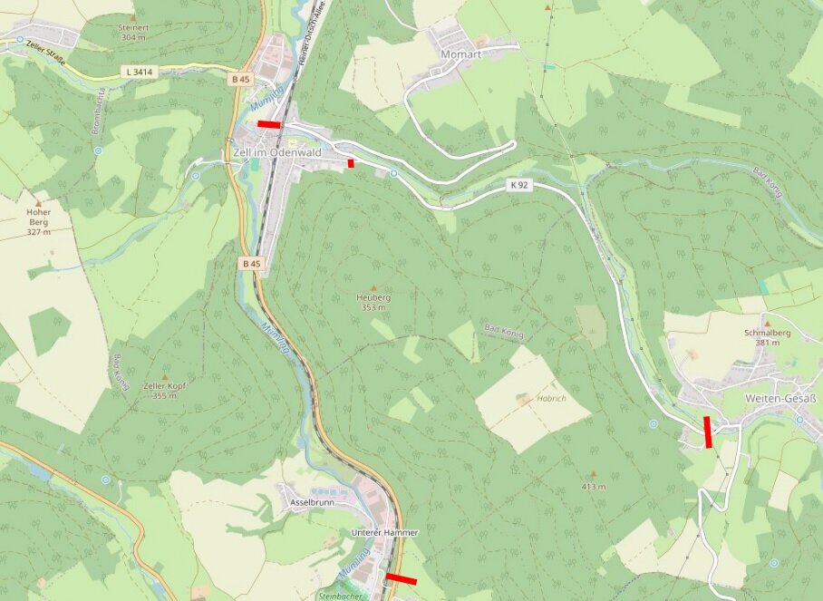 • An der „Königer Straße“ in Zell, vor der Einmündung auf die B45 und L3414. Die Zufahrt zum Café Orth sowie zum Möbel Kempf sind weiterhin möglich.