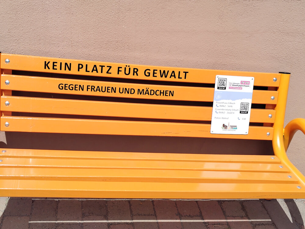 Außerdem ist eine Hinweistafel mit Hilfetelefonnummern (Frauenhaus Erbach, Frauenhausberatung Erbach, Polizei Notruf und Gewalt gegen Frauen) angebracht.