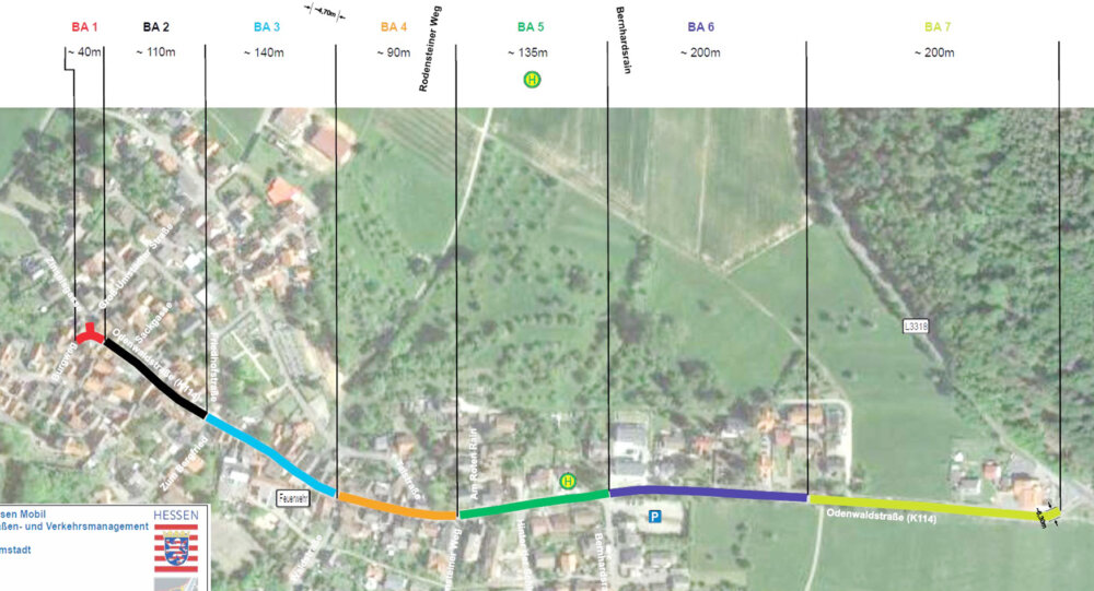 Anschließend werden die Arbeiten sukzessive in Richtung Osten bis zum Ausbauende an der Einmündung der Odenwaldstraße in die L3318 weitergeführt.