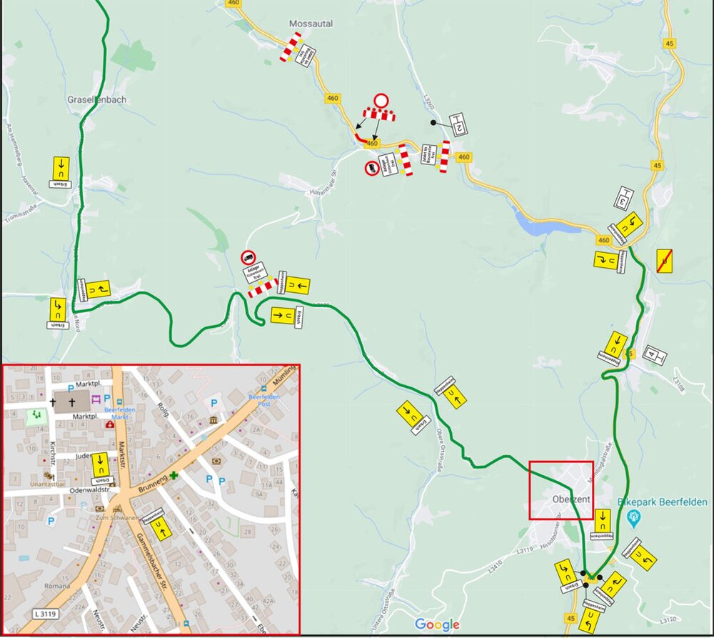 Der Verkehr wird in dieser Zeit großräumig ab der Wegscheide über die Landesstraße L 3105 bis Affolterbach, weiter über die L 3120 bis Beerfelden (Oberzent) und die B 45 zurück zur B 460 geführt (siehe Abbildung).