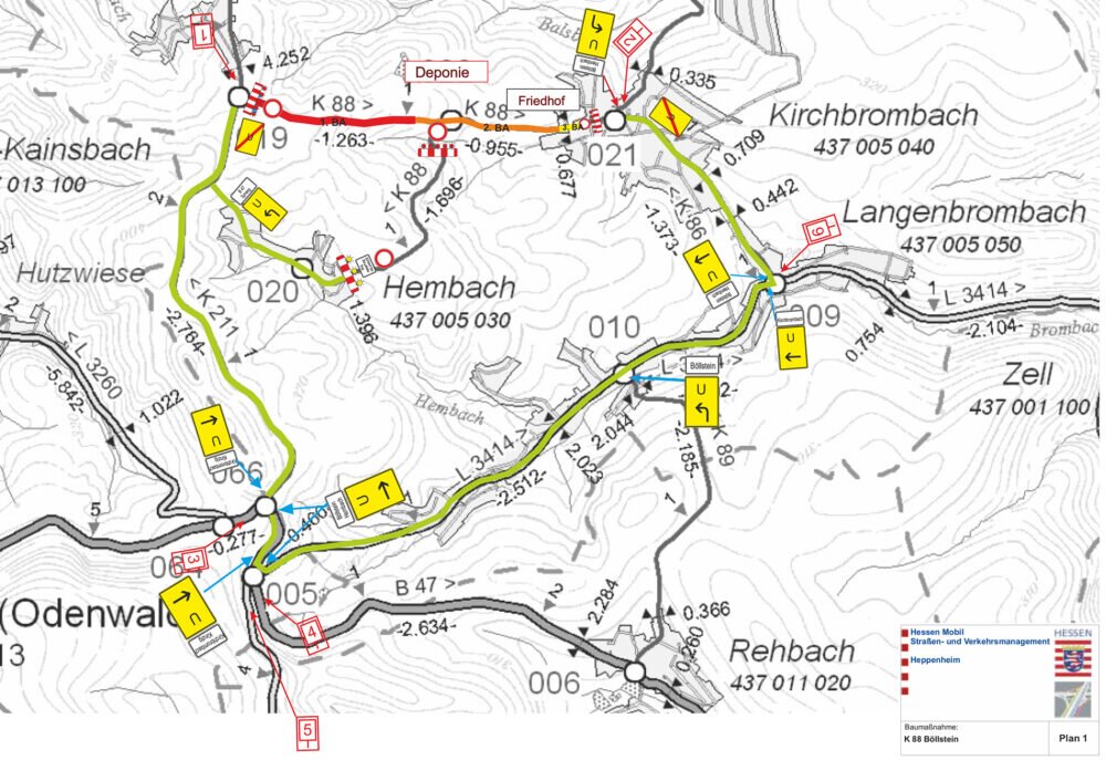 Am kommenden Dienstag, 14. April, beginnt Hessen Mobil mit den Bauarbeiten zur Erneuerung der Fahrbahn der Kreisstraße K 88 auf einer Länge von rund 2,2 Kilometern in der Gemeinde Brombachtal. Im Rahmen der Bauarbeiten erfolgt eine Sanierung der maroden Fahrbahn der Kreisstraße im Streckenabschnitt zwischen Böllstein und der Einmündung in die K 86 (Schulstraße) in Kirchbrombach.