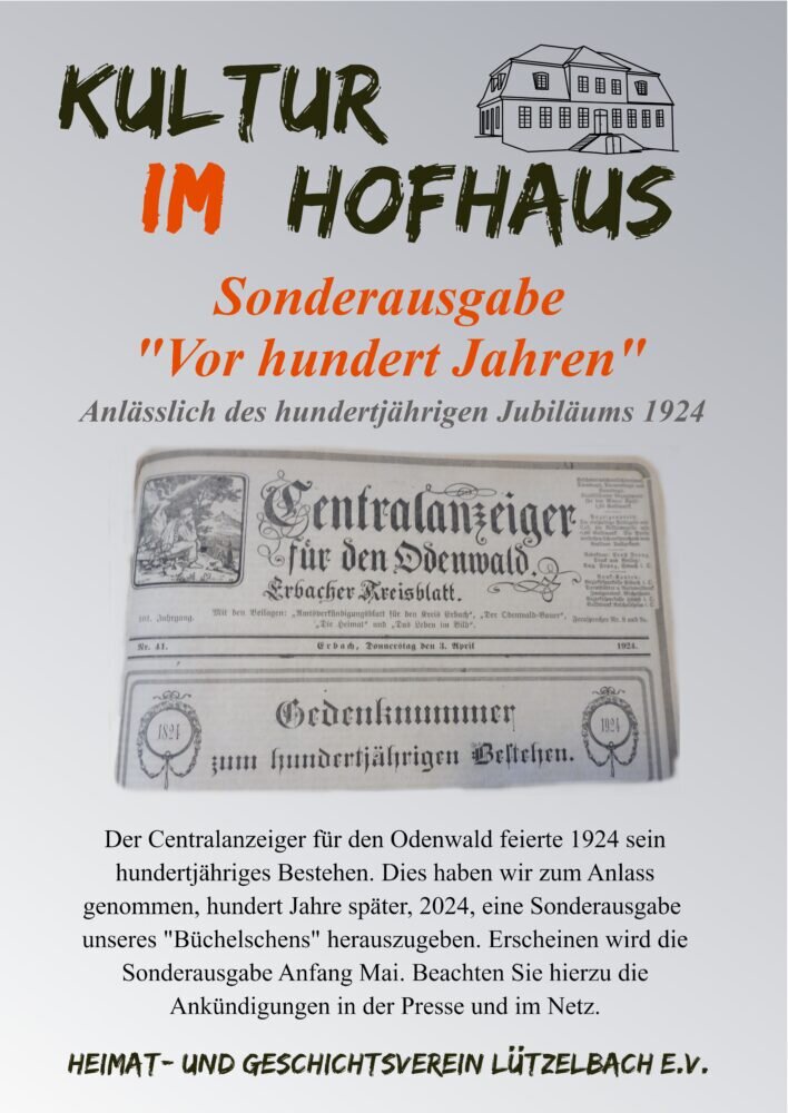 Lützelbach. Der Heimat- und Geschichtsverein Lützelbach gibt eine Sonderausgabe des bekannten Büchelsche „Vor hundert Jahren – aus dem Centralanzeiger für den Odenwald“ heraus – ein Jubi-Büchelsche – mit Ereignissen aus den Jahren 1824 und 1924.