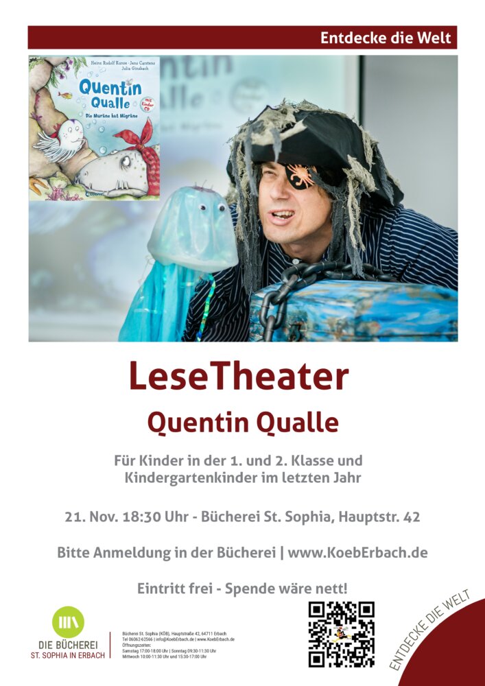 Erbach. In der Bücherei St. Sophia in der Hauptstraße 42 wird am Freitag, 21. November, um 18.30 Uhr die Geschichte „Quentin Qualle – die Muräne hat Migräne“ vorgelesen. Das LeseTheater für Kinder ab vier Jahren erzählt von einer mutigen Qualle, die sich mit Hilfe der Kinder den Muränen stellt, die auf dem Schulweg Probleme machen.