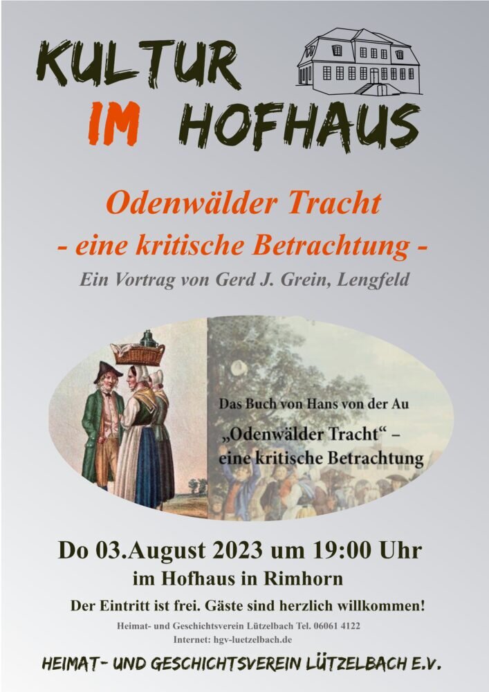 Lützelbach. Der Heimat- und Geschichtsverein Lützelbach veranstaltet in der Reihe „Kultur im Hofhaus“ am Donnerstag, 3. August, um 19 Uhr im Hofhaus einen Vortrag über die Odenwälder Tracht.