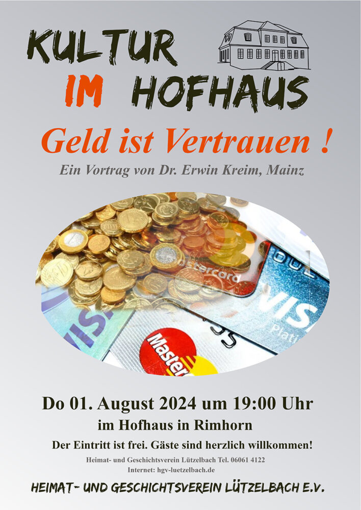 Lützelbach. Am Donnerstag, 1. August, organisiert der Heimat- und Geschichtsverein Lützelbach einen Vortrag mit dem Titel: „Geld ist Vertrauen“. Los geht es um 19 Uhr im Hofhauskeller in Lützelbach-Rimhorn, Rathausstraße 29.