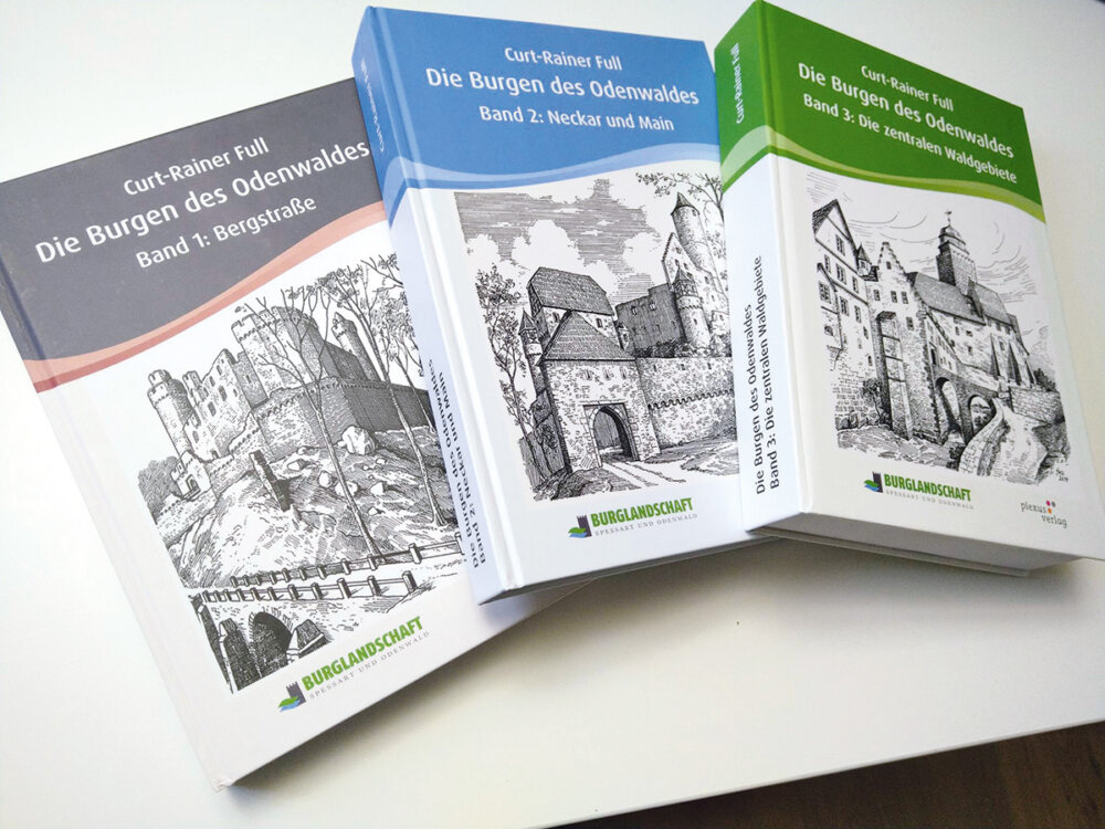 Der Burgenforscher Curt Full aus Schriesheim befasst sich seit vielen Jahren mit Burgen und Schlössern im Odenwald und jenen in den angrenzenden Regionen. Dabei geht es ihm nicht nur um die Geschichte dieser Kulturdenkmäler und der jeweiligen Erbauer und Besitzer, vielmehr auch um die Darstellung ihrer Architektur. Als begnadeter Zeichner sieht er die Burgen und Schlösser aus einem sehr besonderen Blickwinkel und mit sehr viel Gespür für architektonische Details. Er hat alle von ihm betrachteten Burgen in zahlreichen Zeichnungen mit dem Tuschestift festgehalten. So entstanden Übersichten über die Gesamtanlagen, aus verschiedenen Winkeln, auch aus der Vogelperspektive, Detailzeichnungen besonderer Bauelemente, Grund- und Aufrisse der Gesamtanlagen, aber auch von einzelnen Bauelementen, Nachzeichnungen von bereits bestehenden Grafiken und sogar Rekonstruktionszeichnungen. So befasst er sich mit nahezu allen Burgen und Schlössern der Region und fasst jeweils sämtliche Informationen in Textform oder als Zeichnung zusammen. Seine Ergebnisse hat Curt Full in einem außergewöhnlichen dreibändigen Buch mit räumlich differenzierten Inhalten zusammengetragen: