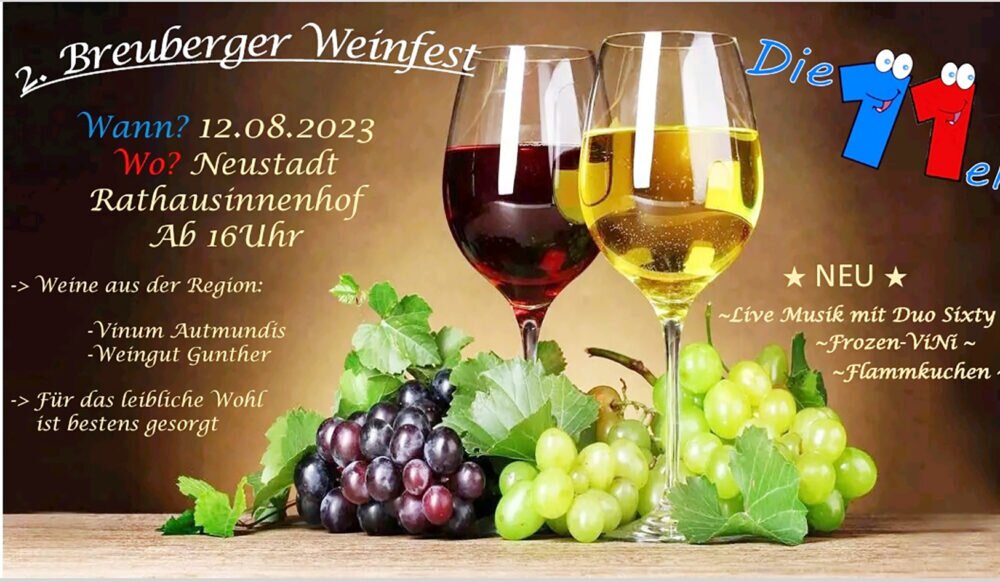 Breuberg. Der Verein “Die 11er” veranstaltet am Samstag, 12. August, ab 16 Uhr das zweite Breuberger Weinfest im Rathausinnenhof im Stadtteil Neustadt.