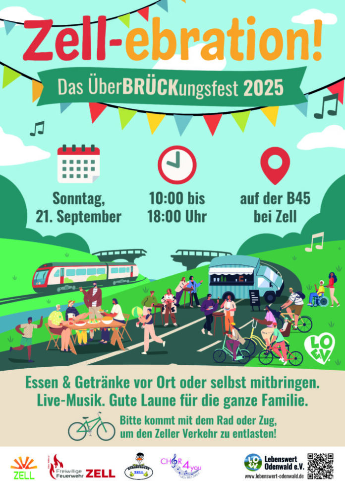 Unter dem Motto „Zell-ebration – Das ÜberBRÜCKungsfest 2025“ laden Zeller Vereine mit kulinarischen Angeboten, Live-Musik von Odenwälder Bands sowie Spiel- und Bastelaktionen für Kinder zum Mitfeiern ein.