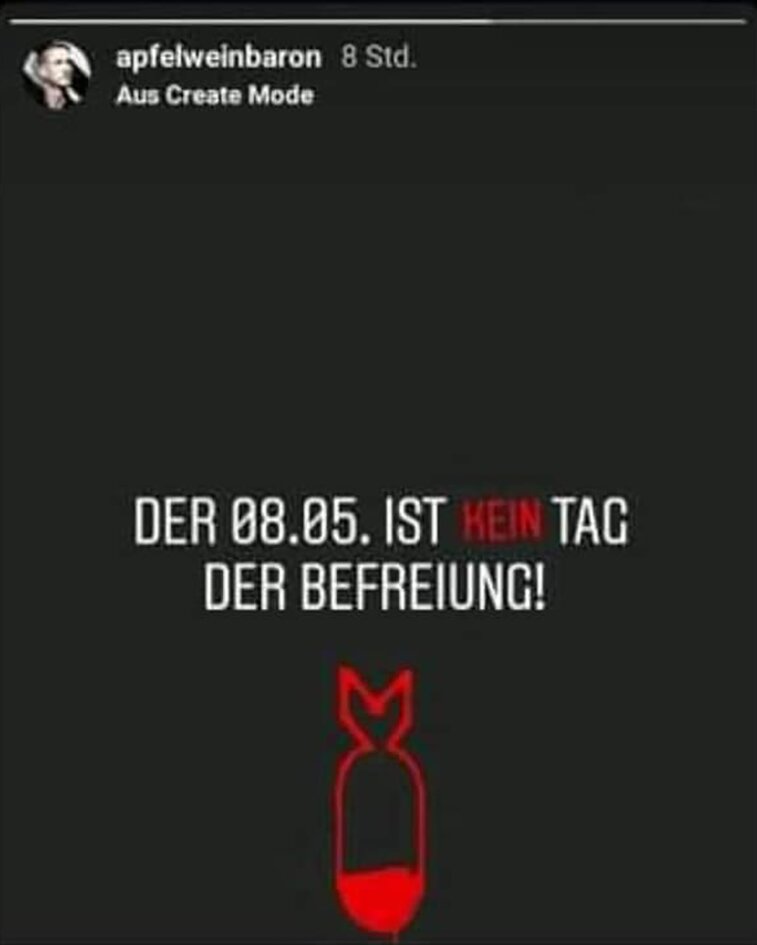 Am 8. Mai hatte der Unternehmer ein Bild mit einer Bombe mit dem Vermerk „Der 8.5. ist kein Tag der Befreiung“ veröffentlicht und in einem Kommentar dazu vermerkt: „Die Alliierten haben nie geplant, Deutschland zu befreien“.