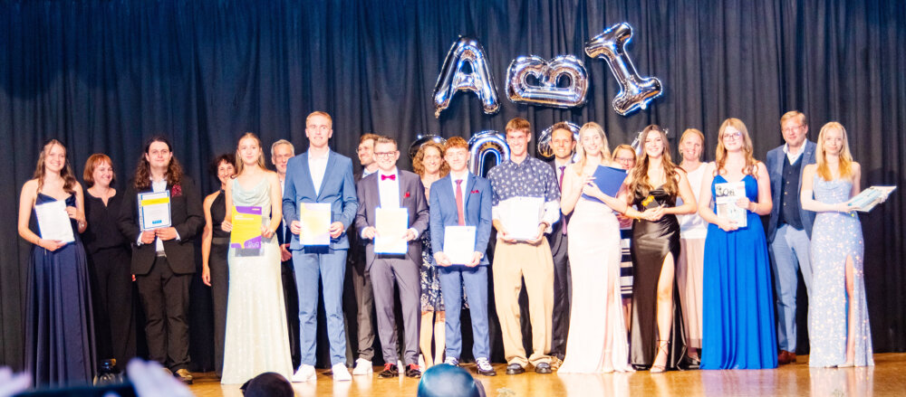 Die Zeugnisverleihung erfolgte durch Schulleiter Bendl, den Leiter der gymnasialen Oberstufe, Dr. Martin Schmidl, und die drei Tutoren. Eine besondere Ehrung erfuhren dabei Giulia Heerstraß und Louise Hervé Krey, die die Note 1,1 erreichten.